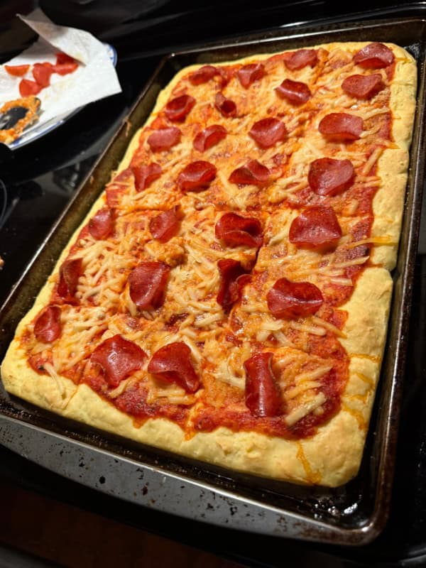 - Transfer the dough to a greased pan. This recipe will fill a large cookie sheet or jelly roll pan.